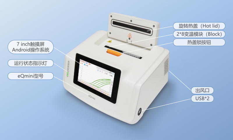 eQmini是在eQ1600系列经典机型的基础上精心设计的一款高性能机型,有2色和4色荧光两个规格。该款仪器自带Android触控屏,搭载自主研发操作分析软件,无需电脑,独立运行。程序编辑、运行、查看以及数据分析、报告打印、手机监控等一机搞定。