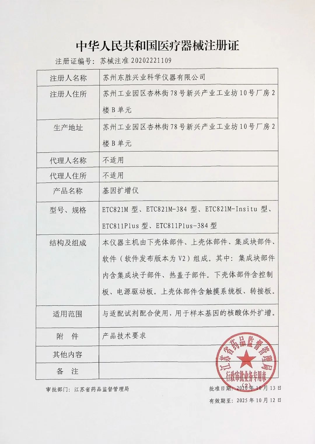 此次医疗器械注册证书的取得,标志着东胜龙品牌PCR仪将有5个规格型号可进入临床诊断领域,这将大大促进东胜龙品牌PCR仪在该领域的销售和应用,提升东胜龙品牌在该领域的品牌影响力!